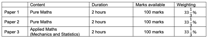 Core Mathematics looks at what Maths is all about, including the rules and patterns that everything is built upon, and consists of four units. Applied Mathematics looks at how Maths can be applied to real situations, in particular the use of data (Statistics) and motion of objects (Mechanics).