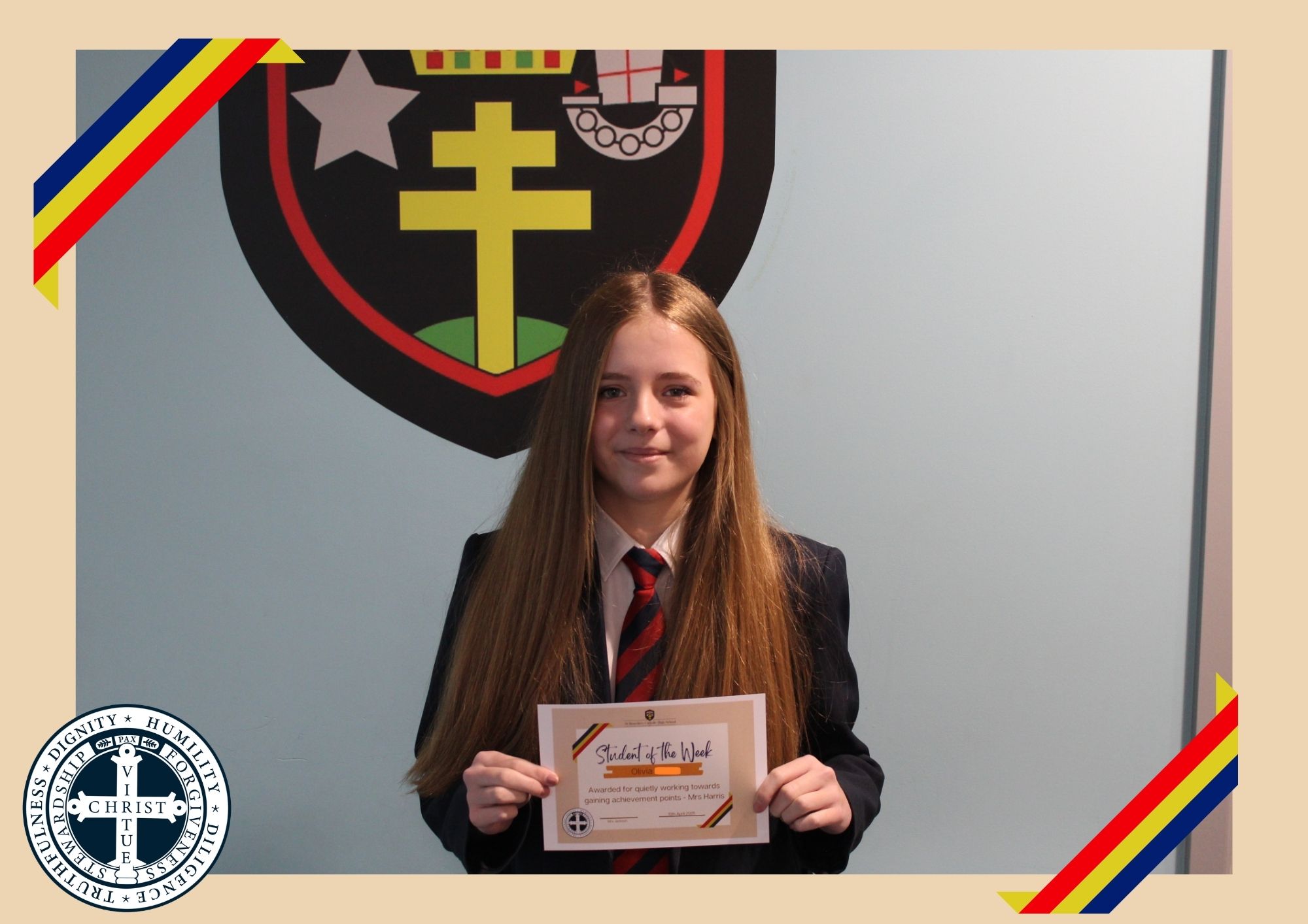 Year 8 – Olivia S – Awarded for quietly working towards gaining achievement points – Mrs Harris