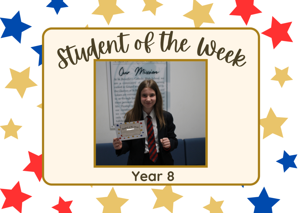Year 7 – Student of the Week – Emma Nicholas – Awarded for enthusiasm and consistent effort in English – Mrs McKee